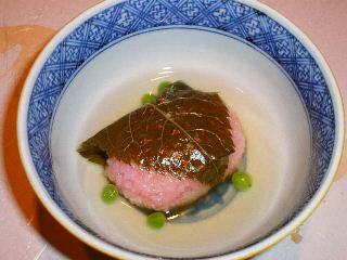 | お茄子の上にのっているのは金目鯛。ちょっと洋風の盛り付けですね。蒸し物は桜の葉っぱに包まれた道明寺。彩りが綺麗です。 |