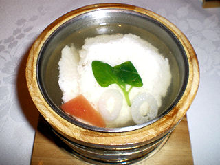 芸術的な味わいと技を楽しむ八宝茶。ジャスミン、紅なつめ、クコ、菊花、氷砂糖、百合根、龍眼、クルミが乾燥して器に入っています。四川料理は辛いので、氷砂糖がとける頃飲むと、お料理にマッチするそうです。この器にティーマスターが高い位置から熱湯を注いでくれます。器の淵におゆがあたるように勢いよく注ぎ、中身をかき混ぜる感じ。このまま飲むと中身が口の中に入ってしまうので、茶托をもち、蓋をしてその隙間からいただきます。