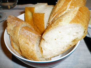 最初に出てくるパン。器がけっこう凝ったデザインです。味は3種類。カリカリタイプのフランスパンとしっとりタイプ。一緒に出てきたタラコ入りのペーストを付けて食べるとGood!!